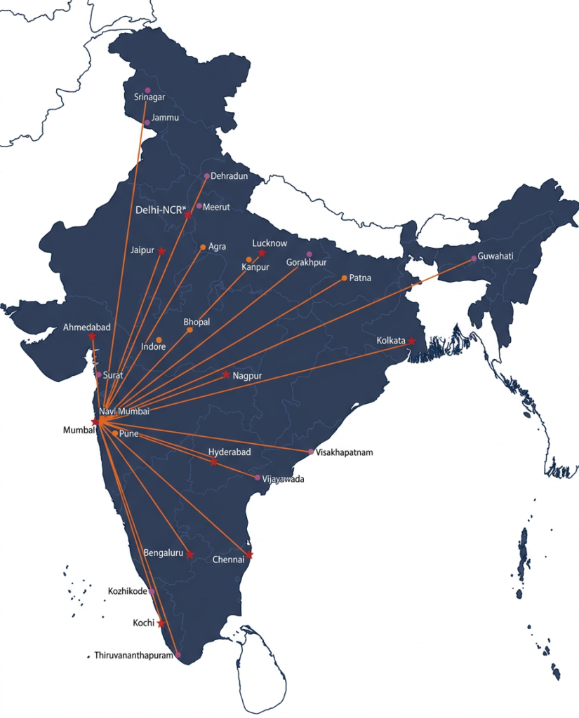 Our network connects key industrial and commercial cities across India, enabling faster routing and reliable deliveries.